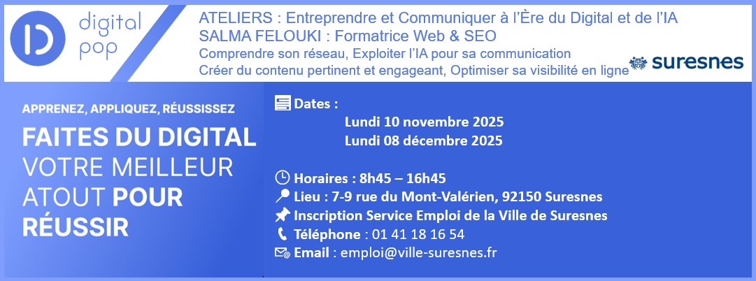 Objectifs de l’atelier : Accompagner les entrepreneurs suresnois dans la valorisation de leur activité grâce aux outils numériques, à l’intelligence artificielle et aux leviers de visibilité en ligne.